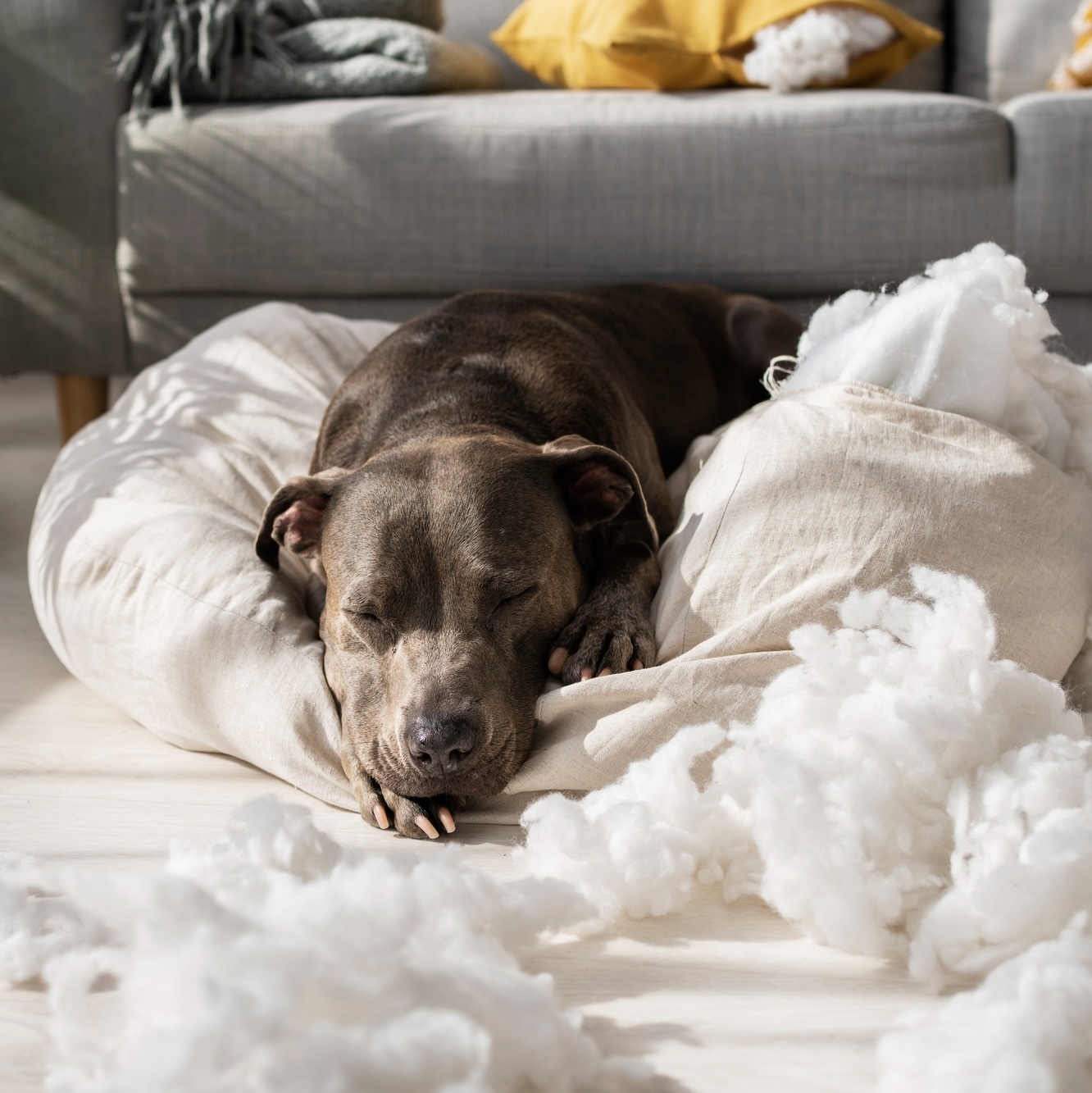 Common signs include: excessive barking or whining, destructive behavior when left alone, trembling or pacing during storms, excessive paw licking, hiding or cowering, aggression or reactivity, difficulty settling or sleeping or anxiety during car rides and vet visits. If your dog shows these behaviors, calming support may help.